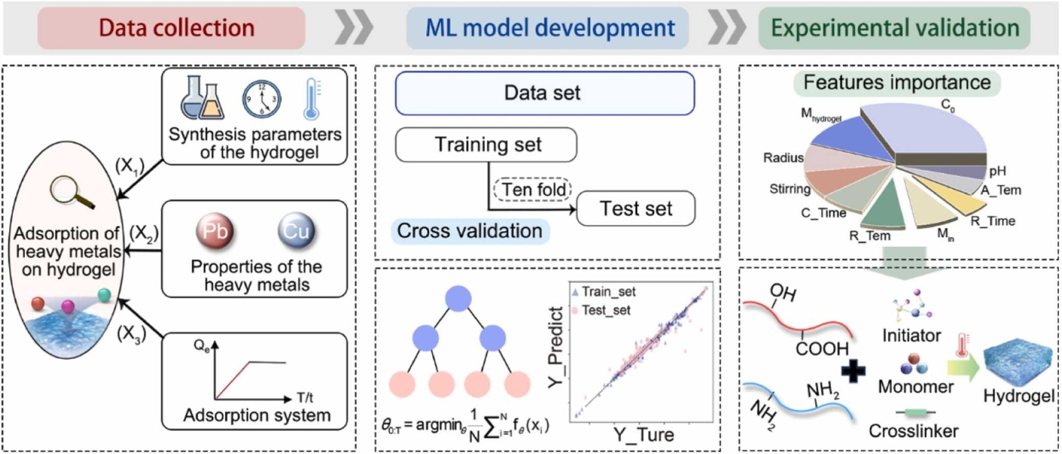 论文利用机器学习和贝叶斯优化方法,设计了用于去除水中有毒金属的高效水凝胶吸附剂。通过改进的XGBoost模型,论文准确预测了水凝胶对有毒金属的吸附系数(Kd),并找出了影响水凝胶性能的关键因素,如反应温度、时间、引发剂和交联剂的用量。通过贝叶斯优化,作者确定了最佳合成条件,制备出的水凝胶展示了优越的吸附能力,显著提高了对铜和铅等金属的去除效率。
